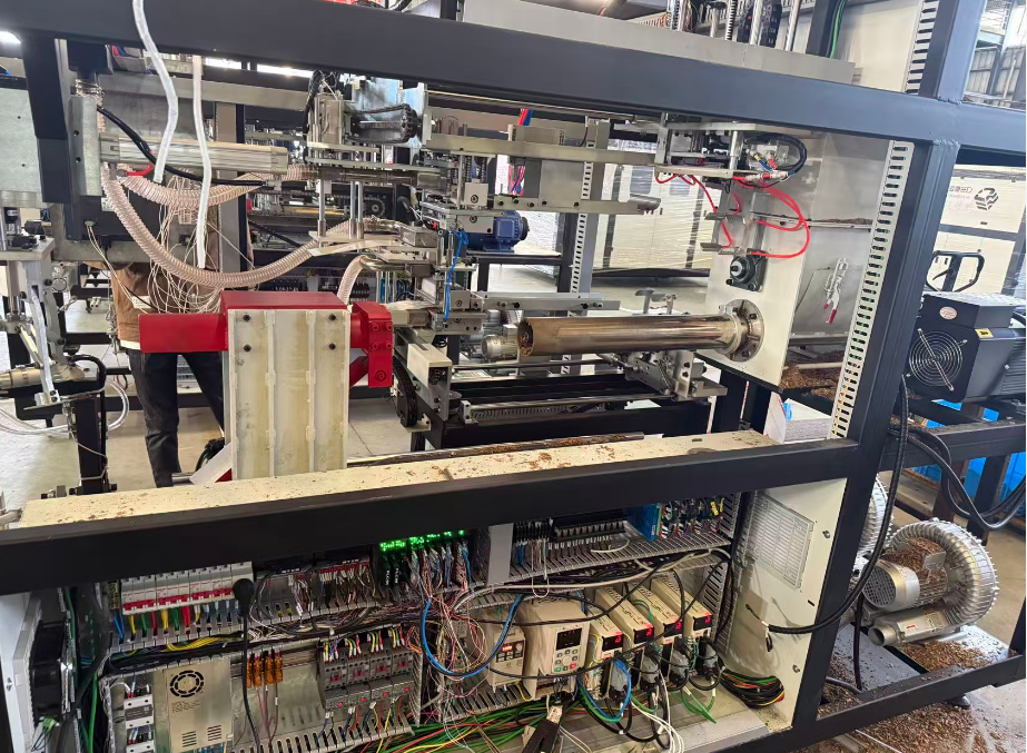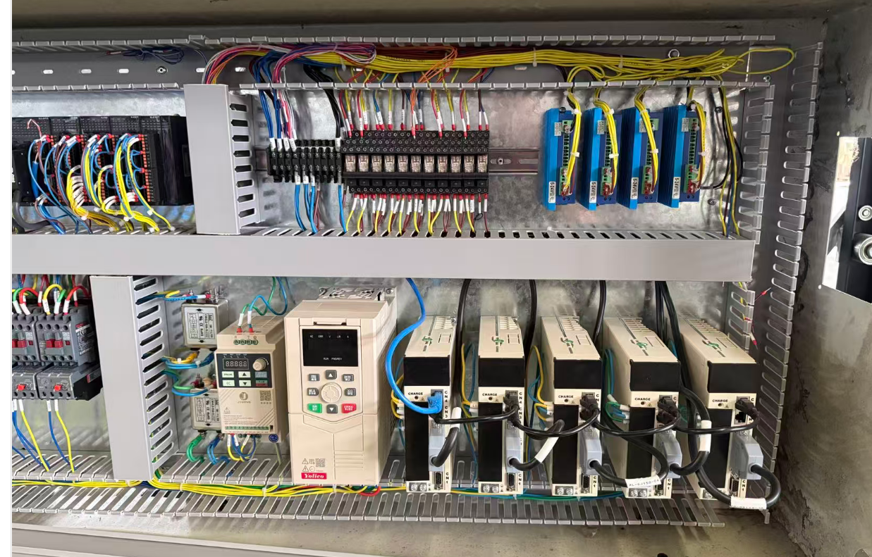 定量装填是机器的核心功能。图片中部的横向圆柱形部件就是装填机构。其内部有一个螺旋输送器(绞龙),通过变频器(YD280T4-11G/15PB)对电机的精确控制,螺旋输送器旋转,将物料从料仓底部推送至出料口,通过控制螺旋输送器的旋转圈数或时间,可以精确控制每袋的装填量,确保每袋重量一致。